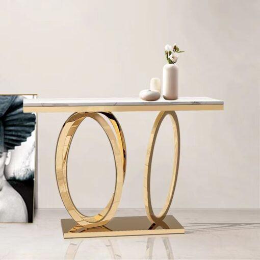Mẫu bàn console này mang lại vẻ đẹp sang trọng và đẳng cấp cho không gian phòng khách của bạn. Chất liệu hợp kim mạ vàng PVD kết hợp với mặt bàn đá tự nhiên tạo ra sự đồng điệu giữa các yếu tố tự nhiên và hiện đại, giúp không gian trở nên tinh tế và cuốn hút hơn. Bộ bàn console này không chỉ là nơi để bạn đặt các món đồ decor mà còn là một phần quan trọng trong việc tạo dựng phong cách sống của gia chủ.