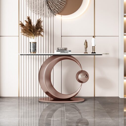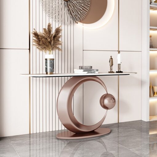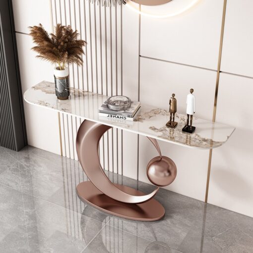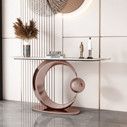 Bàn console nghệ thuật này có thiết kế độc đáo và sang trọng với các chi tiết tinh tế, đặc biệt là phần chân bàn. Chân bàn được thiết kế hình vòng tròn, uốn cong mềm mại, tạo nên một phong cách nghệ thuật và lạ mắt. Sự kết hợp giữa mặt bàn đá tự nhiên và chân hợp kim mạ vàng giúp tạo ra một sản phẩm vừa vững chãi, vừa thanh thoát. Màu sắc vàng hồng và vàng gold được lựa chọn kỹ lưỡng, mang lại sự sang trọng và hiện đại cho sản phẩm. Thiết kế này phù hợp với các không gian yêu cầu sự tinh tế và phong cách nghệ thuật.