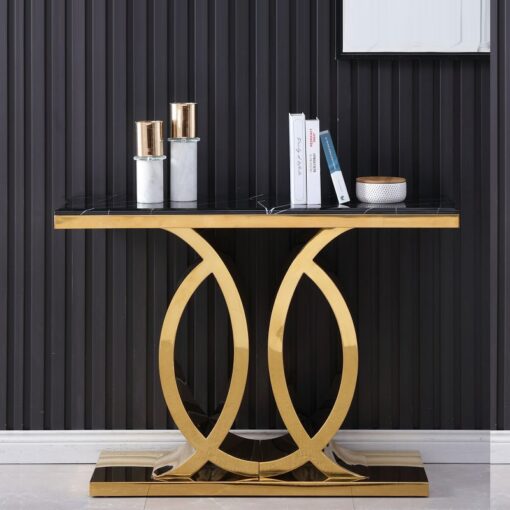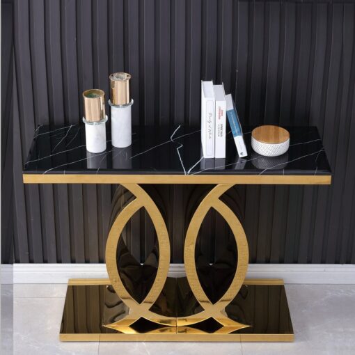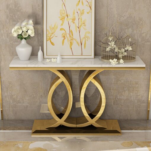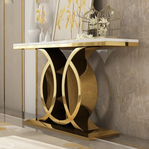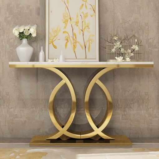 Chiếc bàn console này thực sự toát lên vẻ sang trọng và đẳng cấp với thiết kế tinh tế và màu vàng ánh kim nổi bật. Mặt bàn sử dụng chất liệu đá cao cấp tạo cảm giác chắc chắn, bền bỉ và dễ vệ sinh. Phần chân bàn độc đáo với kiểu dáng vòng tròn đan xen, tạo điểm nhấn nghệ thuật đầy cuốn hút cho không gian phòng khách. Bàn rất phù hợp để trang trí, đặt lọ hoa, sách hay các vật dụng decor khác, góp phần làm tăng thêm nét thẩm mỹ và sự tinh tế cho căn phòng.