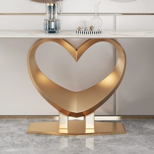 Bàn console trang trí hình tim này mang lại vẻ đẹp sang trọng và đẳng cấp cho không gian phòng khách của bạn. Chất liệu hợp kim mạ vàng PVD kết hợp với mặt bàn đá tự nhiên tạo ra sự đồng điệu giữa các yếu tố tự nhiên và hiện đại, giúp không gian trở nên tinh tế và cuốn hút hơn. Bộ bàn console này không chỉ là nơi để bạn đặt các món đồ trang trí mà còn là một tác phẩm nghệ thuật giúp nâng tầm không gian sống của gia chủ.