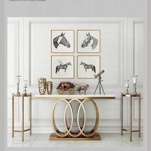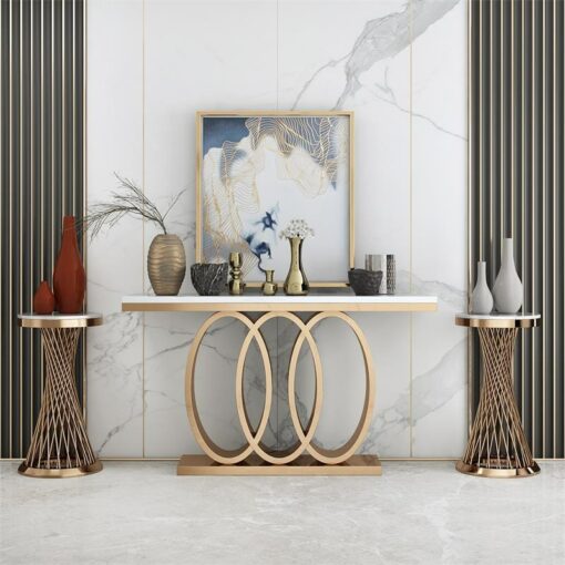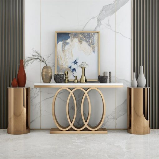 Bàn Decor Hiện Đại Cho Phòng Khách nổi bật với thiết kế tinh tế và sang trọng, kết hợp hài hòa giữa mặt bàn trắng sáng và chân bàn mạ vàng với hình dạng ba vòng tròn đan xen nghệ thuật. Sản phẩm không chỉ là điểm nhấn thẩm mỹ giúp làm tăng vẻ đẹp cho không gian mà còn thể hiện phong cách hiện đại đầy cuốn hút. Bàn phù hợp để trang trí phòng khách, sảnh hoặc hành lang, dễ dàng kết hợp với nhiều phong cách nội thất khác nhau, mang lại cảm giác thanh lịch và tinh tế cho căn phòng.