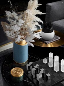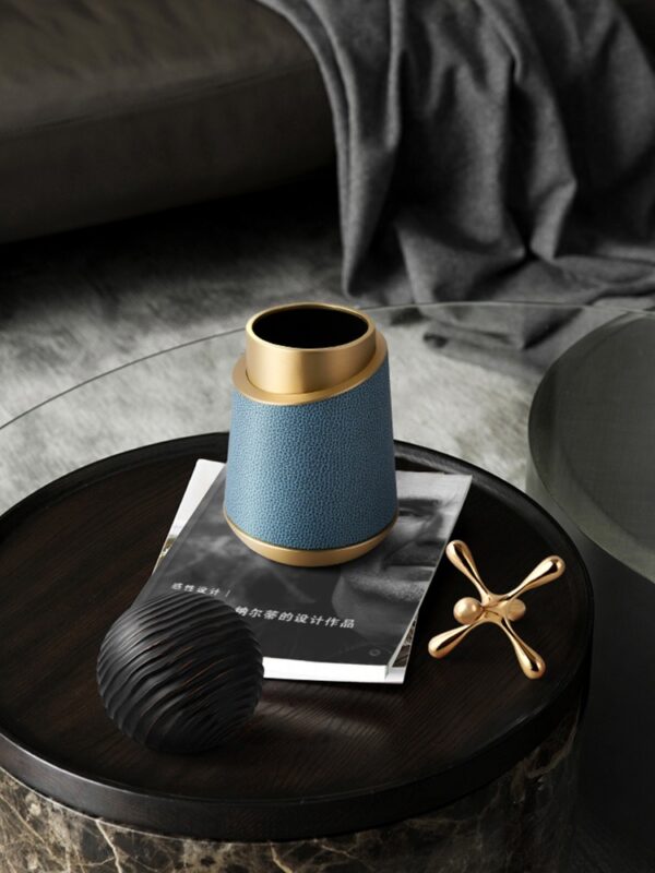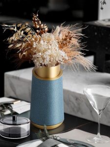 Bình Cắm Hoa Khô Trang Trí có thiết kế độc đáo với lớp vỏ giả da màu xanh thanh lịch, kết hợp cùng viền kim loại vàng tạo điểm nhấn sang trọng. Phong cách tổng thể hiện đại và tinh tế, phù hợp với không gian nội thất cao cấp. Sự kết hợp giữa hoa khô với các tông màu hồng, đỏ và trắng bổ sung hoàn hảo cho màu sắc của bình, tạo nên một bố cục hài hòa và nổi bật. Đây là lựa chọn lý tưởng để trang trí phòng khách hoặc bàn làm việc, mang lại sự ấm áp và tinh tế cho không gian.