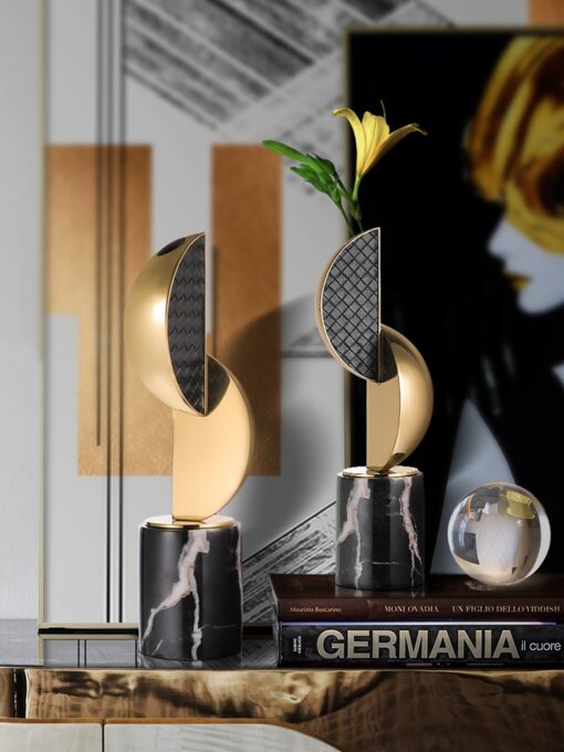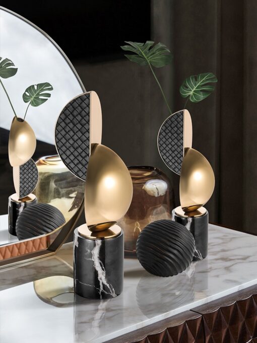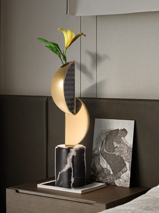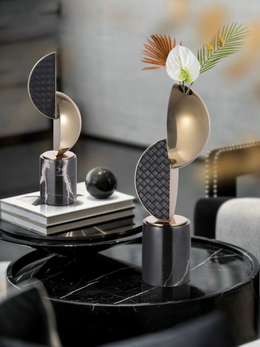 Phần chân đế được thiết kế từ đá cẩm thạch vững chắc, tạo cảm giác sang trọng và đẳng cấp. Sự kết hợp giữa kim loại ánh vàng và họa tiết bề mặt đen nhám tạo sự tương phản độc đáo, mang lại cảm giác hiện đại nhưng không kém phần ấm cúng. Bình hoa này không chỉ để cắm hoa mà còn mang ý nghĩa phong thủy, tượng trưng cho sự cân bằng và thịnh vượng.
