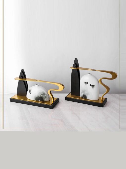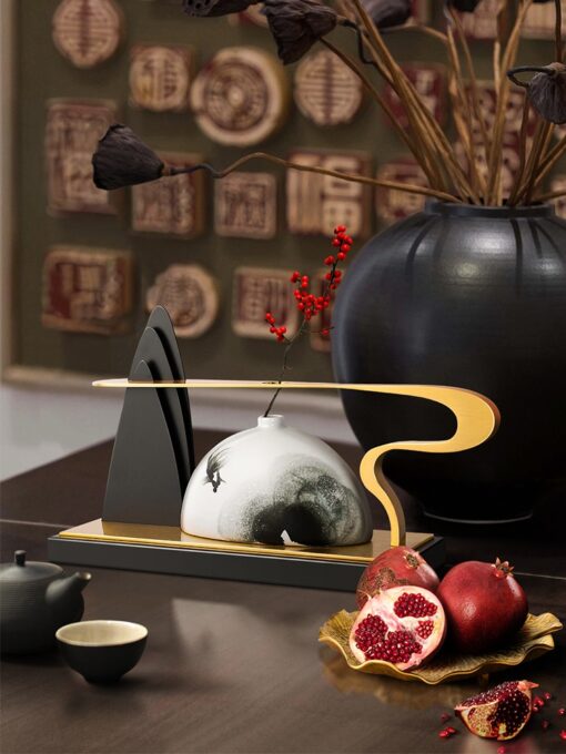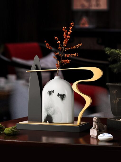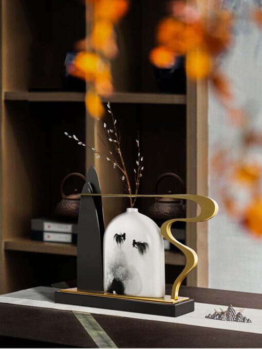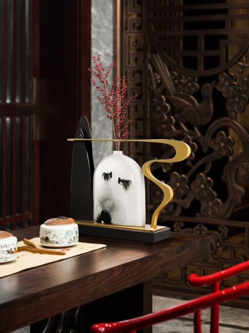 Đây là một bình hoa bằng gốm mang phong cách Trung Hoa rất độc đáo và tinh tế. Bình có dáng tròn, bề mặt trắng mịn với các nét vẽ thủy mặc màu đen, tạo nên sự hài hòa giữa cổ điển và hiện đại. Bình được đặt trên một đế trang trí với các chi tiết kim loại màu vàng sáng tạo hình uốn lượn mềm mại, kết hợp với một chi tiết đen đứng thẳng, làm tăng tính thẩm mỹ và sự sang trọng cho sản phẩm.