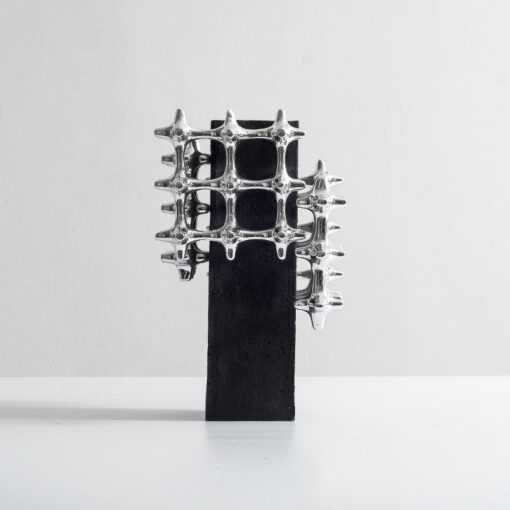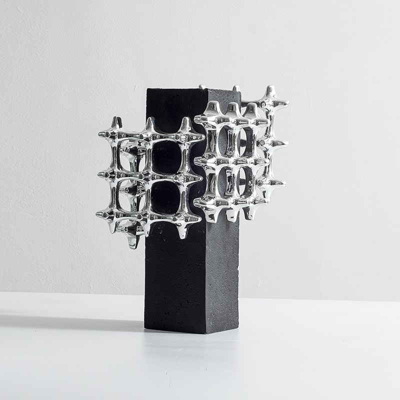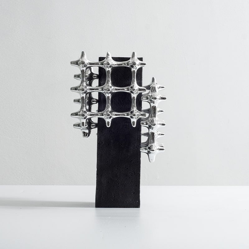 Điểm nhấn của bình hoa là cấu trúc kim loại được bố trí đa chiều như những ô vuông sáng bóng xen kẽ phần thân gốm mờ tạo nên sự tương phản hấp dẫn. Thiết kế này không chỉ mang tính thẩm mỹ cao mà còn góp phần tạo nên nét hiện đại, nghệ thuật cho sản phẩm.