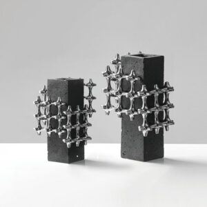 Bình hoa sở hữu thiết kế khối hình học độc đáo với các lớp kim loại được bố trí đa chiều tạo hiệu ứng thị giác bắt mắt, kết hợp cùng phần thân gốm màu sắc trang nhã. Sản phẩm có hai kích thước linh hoạt phù hợp cho nhiều không gian khác nhau từ phòng khách đến phòng làm việc.