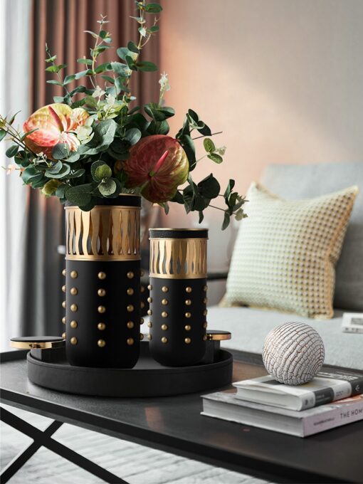 Bình cắm hoa phong cách châu Âu này mang vẻ đẹp sang trọng và lịch lãm với tông màu đen chủ đạo kết hợp tinh tế cùng chi tiết mạ vàng. Thiết kế bình cao, dáng trụ tròn với các chi tiết nổi bật như chấm bi mạ vàng và họa tiết hình ngọn lửa ở phần trên tạo điểm nhấn cuốn hút. Sản phẩm đi kèm khay tròn màu đen nhấn vàng, giúp tăng thêm tính tiện dụng và thẩm mỹ. Bình hoa phù hợp để trang trí phòng khách hoặc không gian làm việc hiện đại, thể hiện gu thẩm mỹ tinh tế và đẳng cấp của chủ nhân.