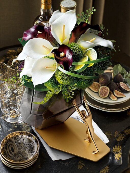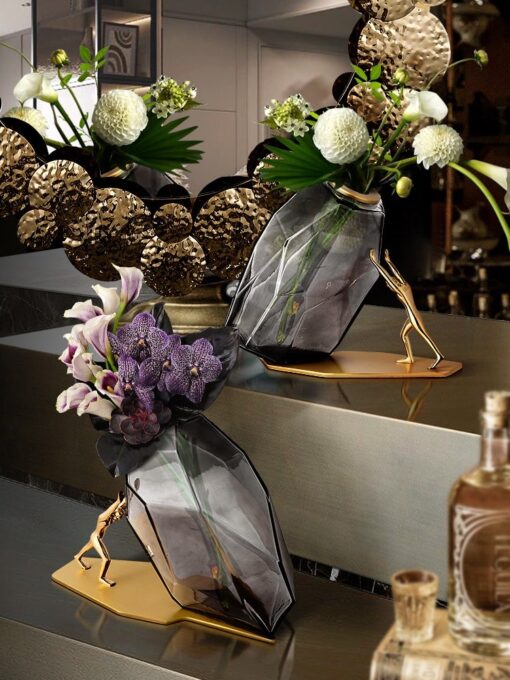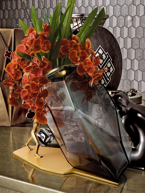 Bình cắm hoa thủy tinh sáng tạo này thực sự là một tác phẩm nghệ thuật đương đại. Với thiết kế hình học độc đáo, bình thủy tinh màu khói mờ mang đến vẻ bí ẩn và hiện đại. Phần đế vàng bóng lấp lánh cùng tượng người vàng đang đẩy bình tạo điểm nhấn đầy sáng tạo và tinh tế. Hoa khô màu cam ấm áp được cắm trong bình, làm nổi bật sự hài hòa giữa thiên nhiên và nghệ thuật. Sản phẩm không chỉ là món đồ trang trí tuyệt vời cho phòng khách, bàn làm việc mà còn thể hiện phong cách cá nhân độc đáo và gu thẩm mỹ tinh tế.