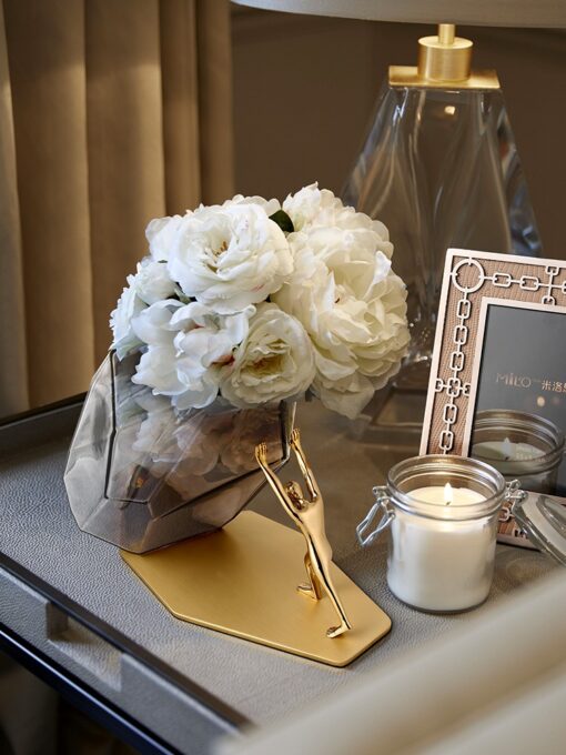 - Trang trí phòng ngủ: Để bình hoa thủy tinh sáng tạo trên bàn trang điểm, bàn đầu giường hay kệ tủ sẽ mang đến không gian thư giãn và dễ chịu. Sự kết hợp giữa thiết kế hiện đại và chất liệu cao cấp sẽ làm cho phòng ngủ của bạn thêm phần ấm cúng.