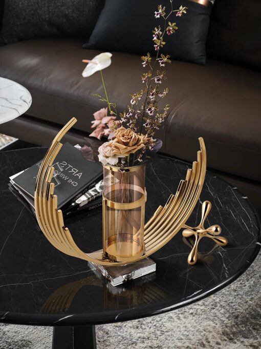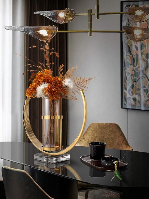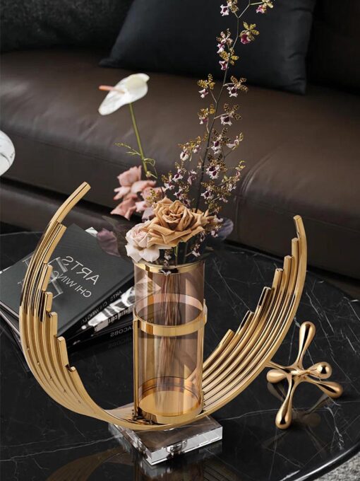Bình hoa thủy tinh nghệ thuật này thực sự là điểm nhấn tuyệt vời cho không gian nội thất hiện đại. Với thiết kế vòng cung bằng kim loại vàng ánh kim kết hợp cùng thân bình thủy tinh trong suốt màu nâu nhẹ nhàng, sản phẩm mang vẻ đẹp tinh tế và sang trọng. Hoa khô màu cam và trắng được cắm một cách khéo léo, tạo nên sự hài hòa giữa màu sắc và hình khối. Bình hoa không chỉ là vật trang trí mà còn là biểu tượng của sự sáng tạo và phong cách thẩm mỹ tinh tế, phù hợp với phòng khách, bàn ăn hoặc phòng làm việc.