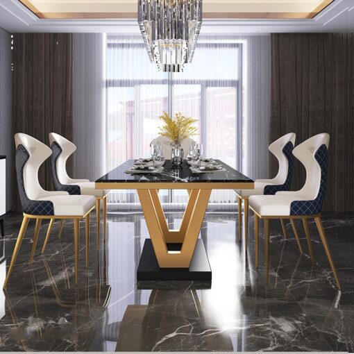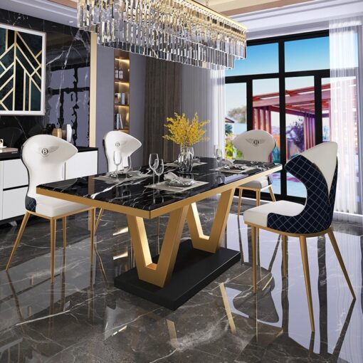 Bộ bàn ăn chân chữ V sang trọng là điểm nhấn đẳng cấp cho không gian phòng ăn hiện đại. Mặt bàn đá đen vân mây tinh tế kết hợp cùng chân bàn mạ vàng hình chữ V tạo nên vẻ đẹp mạnh mẽ, khỏe khoắn mà vẫn thanh lịch. Ghế ăn thiết kế độc đáo với phần lưng uốn cong ôm sát cơ thể, mang lại sự thoải mái tối ưu. Sự phối hợp hài hòa giữa màu sắc và kiểu dáng giúp bộ bàn ăn này không chỉ đẹp mắt mà còn nâng tầm gu thẩm mỹ cho ngôi nhà bạn.