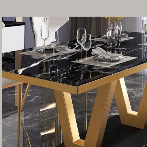Bộ bàn ăn chân chữ V này tạo nên một không gian sang trọng và đẳng cấp cho phòng ăn của bạn. Chất liệu hợp kim mạ vàng PVD kết hợp với mặt bàn đá cao cấp mang lại sự quý phái và bền bỉ. Bộ bàn ăn này sẽ là một điểm nhấn hoàn hảo, giúp không gian của bạn trở nên ấn tượng và cuốn hút hơn bao giờ hết. Bạn có thể kết hợp bộ bàn ăn này với bàn console để tạo nên sự đồng nhất và vẻ đẹp toàn diện cho không gian phòng ăn.