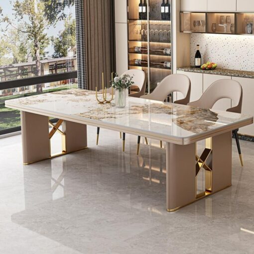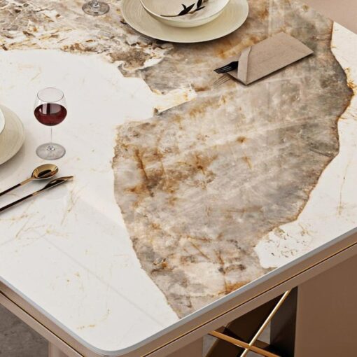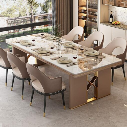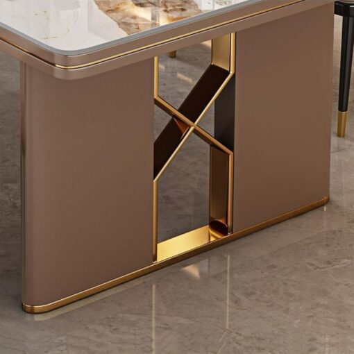 Bộ bàn ăn này có thiết kế tối giản nhưng vô cùng tinh tế, với chân bàn làm từ hợp kim mạ vàng PVD kết hợp với mặt bàn đá tự nhiên. Đường nét của bộ bàn ăn này không chỉ mang lại vẻ đẹp sang trọng mà còn thể hiện sự tinh tế và đẳng cấp. Kiểu dáng hình chữ nhật của bàn ăn phù hợp với mọi không gian phòng ăn, từ không gian nhỏ gọn đến phòng ăn rộng lớn.