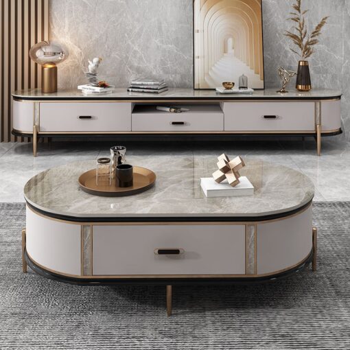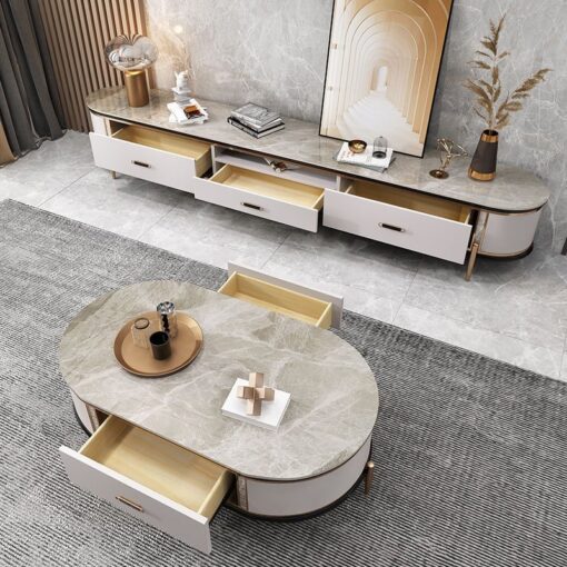 Bộ kệ tivi và bàn trà này mang lại vẻ đẹp sang trọng và đẳng cấp cho phòng khách của bạn. Chất liệu hợp kim mạ kết hợp với gỗ tự nhiên tạo ra sự đồng điệu giữa các yếu tố tự nhiên và hiện đại, giúp không gian trở nên tinh tế và cuốn hút. Bộ sản phẩm này không chỉ là nơi để bạn đặt kệ tivi và thưởng thức trà, mà còn là một phần quan trọng trong việc trang trí không gian sống của bạn. Nếu bạn muốn không gian thêm phần hoàn hảo, bạn cũng có thể kết hợp bộ sản phẩm này với bàn console để tạo sự hài hòa và thống nhất cho không gian phòng khách của mình.