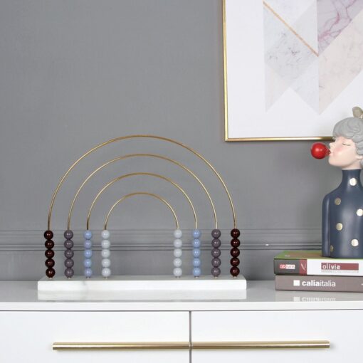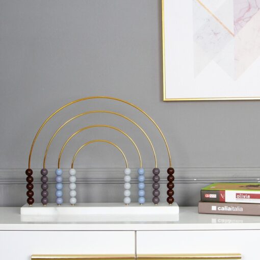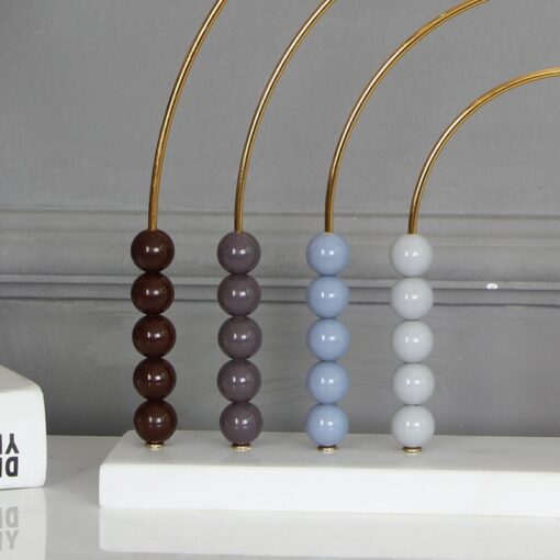 Bộ bàn tính trang trí với thiết kế nghệ thuật lấy cảm hứng từ hình ảnh cầu vồng và bàn tính cổ điển. Sản phẩm gồm các hạt cầu nhiều màu sắc được xếp trên các thanh kim loại uốn cong tạo thành các vòng cung giống hình cầu vồng, đặt trên khung đế chắc chắn, màu trắng tinh tế. Các màu sắc được phối hài hòa gồm nâu, xám, xanh nhạt và trắng tạo nên nét sang trọng, hiện đại mà vẫn đậm chất phong thủy.