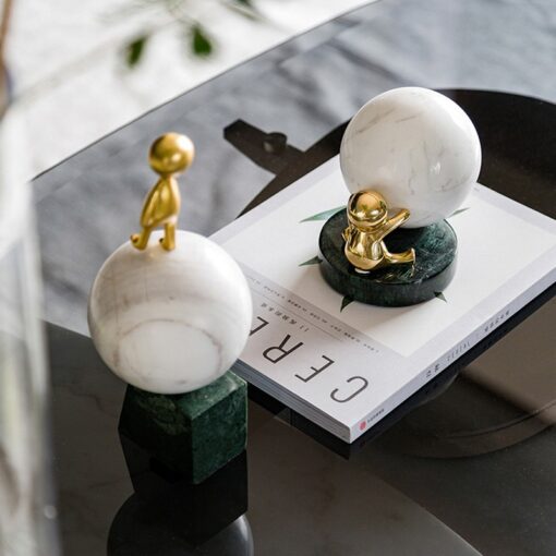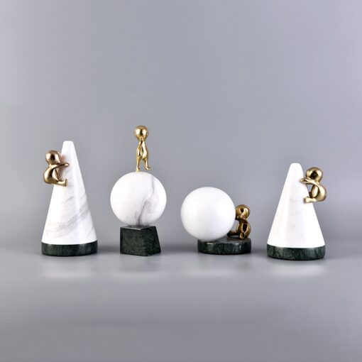 Đá cẩm thạch trắng tinh khiết chính là nền tảng của sản phẩm, mang đến vẻ đẹp vừa tự nhiên vừa trang nhã. Điểm nhấn chính là những nhân vật nhỏ làm bằng đồng mạ vàng, tạo sự tương phản độc đáo, thu hút ánh nhìn ngay từ lần đầu tiên. Thiết kế này không chỉ thể hiện sự tỉ mỉ trong từng chi tiết mà còn mang lại cảm giác vững chãi, ổn định – tượng trưng cho nền tảng bền vững của sự thành công.