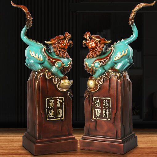 “Cặp Tỳ Hưu Chiêu Tài Bảo Vệ Phú Quý” là bộ tượng phong thủy độc đáo và sang trọng, kết hợp hài hòa giữa màu xanh ngọc và sắc nâu trầm ấm của chân đế giả gỗ. Từng con tỳ hưu được chạm khắc tinh xảo với biểu cảm uy nghi, mạnh mẽ, mang ý nghĩa thu hút tài lộc và bảo vệ sự giàu có cho gia chủ. Hoa văn sắc nét và chi tiết tinh tế tạo nên điểm nhấn nghệ thuật nổi bật. Đây là lựa chọn tuyệt vời để đặt tại phòng khách, văn phòng hoặc không gian thờ cúng, góp phần gia tăng vận may và sự thịnh vượng.