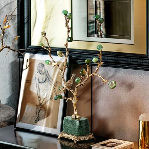Cây tài lộc đá ngọc bích thường được thiết kế với các nhánh cây uốn lượn mềm mại, cành lá tỏa ra xung quanh như thu hút năng lượng vào thân cây. Đế của cây thường được làm từ đá cẩm thạch hoặc đá thạch anh, tạo cảm giác vững chắc, bền bỉ. Các viên đá ngọc bích được gắn lên các nhánh cây, tượng trưng cho hoa quả tài lộc đang kết trái, sẵn sàng thu hút phúc lộc vào không gian sống.