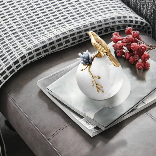 Tượng trang trí Chim Hót Trên Quả Cầu Đá Tinh Khiết được chế tác từ các chất liệu cao cấp, với hình ảnh chú chim mạ vàng tỏa sáng trên quả cầu đá trắng tinh khiết. Từng đường nét của sản phẩm đều được chăm chút tỉ mỉ, từ đôi cánh mảnh mai của chim đến cành cây đính đá pha lê lấp lánh. Những chi tiết này không chỉ tạo nên sức hút đặc biệt mà còn toát lên sự sang trọng, tinh tế, phù hợp với các không gian hiện đại hoặc cổ điển.