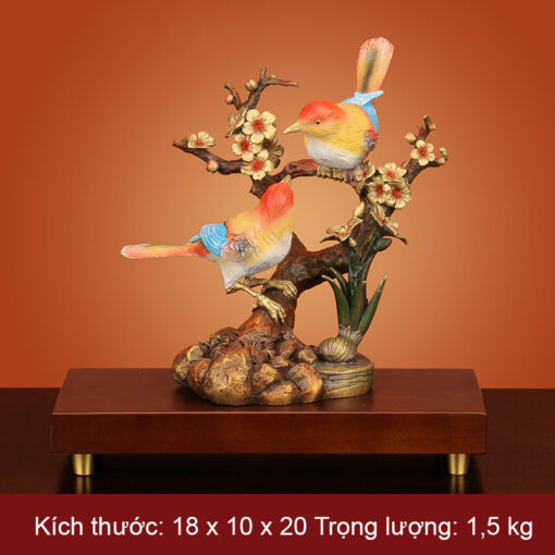 Tượng “Đôi Chim Khuyên” mang vẻ đẹp tinh tế và sống động, tạo điểm nhấn nổi bật cho không gian nội thất. Hai chú chim được chế tác tỉ mỉ với màu sắc rực rỡ, hòa quyện cùng cành hoa mai vàng quý phái, biểu tượng cho sự hạnh phúc và may mắn. Chất liệu bền đẹp và lớp hoàn thiện sắc nét giúp sản phẩm trở thành món quà trang trí sang trọng, thích hợp cho phòng khách, phòng làm việc hay bàn làm việc. Đôi chim khuyên không chỉ làm đẹp không gian mà còn mang ý nghĩa gắn kết tình thân và tài lộc đến cho gia chủ.