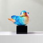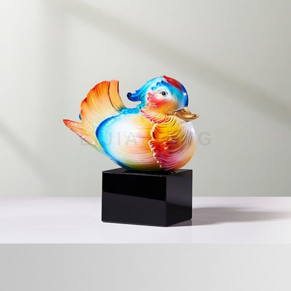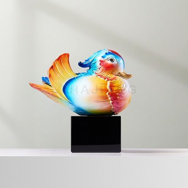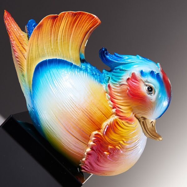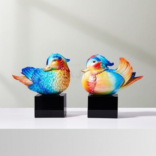 Sản phẩm được chế tác tỉ mỉ từ chất liệu hợp kim và pha lê cao cấp, với từng chi tiết của đôi chim uyên ương được chạm khắc tinh xảo. Đôi cánh mềm mại, ánh sắc lung linh cùng sự kết hợp của những gam màu rực rỡ như xanh lam, vàng ánh kim và cam đỏ tạo nên một tác phẩm sống động. Màu sắc được phối hài hòa không chỉ giúp đôi chim nổi bật mà còn làm sáng bừng không gian.