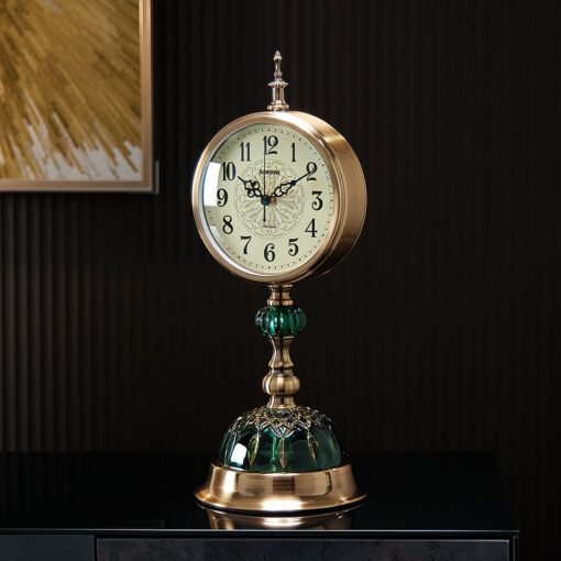Đồng Hồ Để Bàn Kiểu Cổ Điển mang vẻ đẹp trang nhã và tinh tế với thiết kế sang trọng, cổ kính. Sản phẩm nổi bật với lớp vỏ kim loại mạ vàng bóng loáng kết hợp phần đế thủy tinh màu xanh lục quý phái, tạo nên điểm nhấn nổi bật cho không gian. Mặt đồng hồ truyền thống với chữ số rõ ràng cùng kim giờ cách điệu mang lại sự sang trọng và dễ nhìn. Đây là lựa chọn hoàn hảo cho phòng khách, phòng làm việc hoặc không gian cần sự lịch lãm và phong cách cổ điển đậm chất hoàng gia.