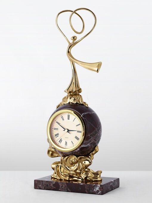 Đồng hồ để bàn phong cách châu Âu này toát lên vẻ sang trọng và tinh tế nhờ thiết kế đậm chất cổ điển. Thân đồng hồ bằng đá hoa cương nâu tròn trịa kết hợp với các chi tiết mạ vàng tỉ mỉ, đặc biệt là tượng người vàng uốn lượn mềm mại phía trên tạo nên điểm nhấn nghệ thuật độc đáo. Mặt đồng hồ cổ điển với số La Mã giúp dễ dàng quan sát thời gian. Sản phẩm phù hợp làm điểm trang trí sang trọng cho phòng khách, phòng làm việc hoặc bàn tiếp khách, thể hiện gu thẩm mỹ đẳng cấp và quý phái của chủ nhân.