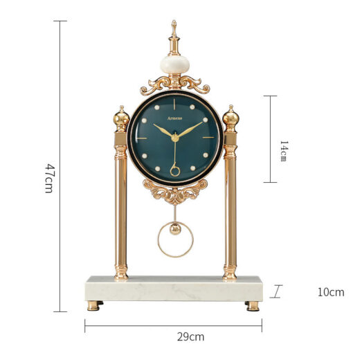 Đồng Hồ Phong Thái Hoàng Gia mang nét đẹp cổ điển với thiết kế họa tiết cầu kỳ, tỉ mỉ. Khung đồng hồ được làm từ chất liệu hợp kim mạ, phủ lớp ánh vàng sang trọng, kết hợp với mặt đá cẩm thạch tự nhiên tạo nên vẻ đẹp trường tồn với thời gian. Đồng thời, các chi tiết tinh xảo như mặt số đồng hồ mạ vàng và con lắc được chế tác công phu càng tôn lên giá trị thẩm mỹ vượt bậc của sản phẩm.