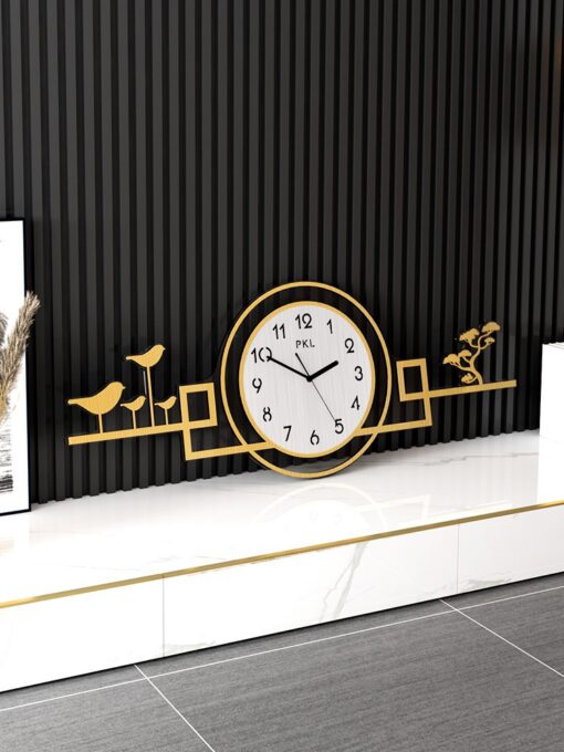 Khung đồng hồ làm từ kim loại mạ vàng sáng bóng không chỉ làm tăng tính thẩm mỹ mà còn mang ý nghĩa phong thủy mạnh mẽ. Kim loại vàng tượng trưng cho sự giàu có, thành công và thịnh vượng, giúp gia chủ kích hoạt vận khí tốt trong không gian sống.
