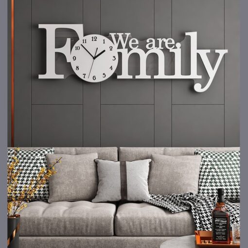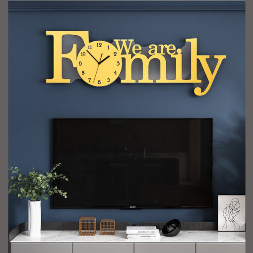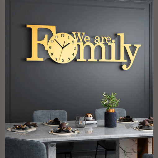 Đồng hồ mang phong cách hiện đại với dòng chữ “We Are Family” được tạo hình khéo léo và ấn tượng. Các chữ cái lớn, kiểu dáng mềm mại nhưng không kém phần mạnh mẽ, được làm từ kim loại phủ sơn vàng ánh kim, nổi bật trên nền tường. Điểm nhấn nằm ở chiếc đồng hồ tròn nhỏ gọn, hài hòa với tổng thể thiết kế. Tất cả tạo nên một sự kết hợp vừa mang tính thẩm mỹ vừa thể hiện giá trị tinh thần sâu sắc.