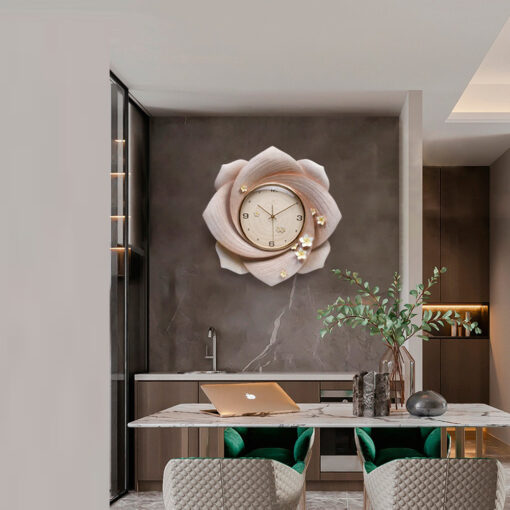 Hình dáng của đồng hồ treo tường nghệ thuật này được lấy cảm hứng từ một bông hoa đang nở, với những cánh hoa mềm mại ôm trọn mặt đồng hồ. Sự kết hợp giữa các chi tiết tự nhiên và yếu tố hiện đại mang lại cảm giác hài hòa, phù hợp với mọi phong cách nội thất từ cổ điển đến hiện đại.
