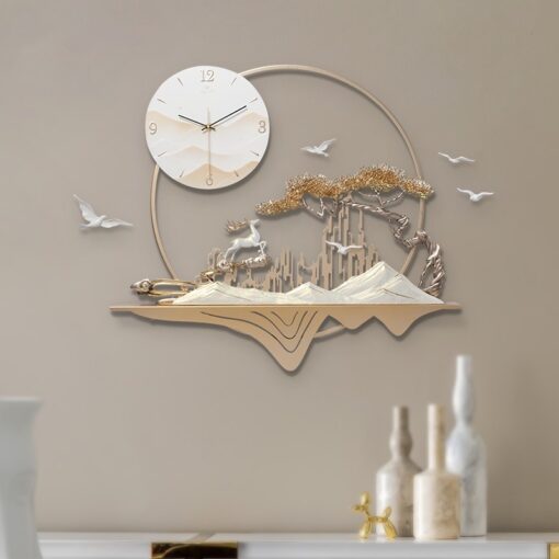 Thiết kế của đồng hồ treo tường nghệ thuật này tái hiện lại khung cảnh sơn thủy hữu tình với những chi tiết tỉ mỉ và sắc nét. Hình ảnh núi non vững chãi, cây tùng xanh mướt cùng đàn hươu nai nhẹ nhàng dưới chân mang lại cảm giác yên bình và thư thái. Đây không chỉ là một thiết kế đẹp mắt mà còn tượng trưng cho sự thịnh vượng và phát triển.