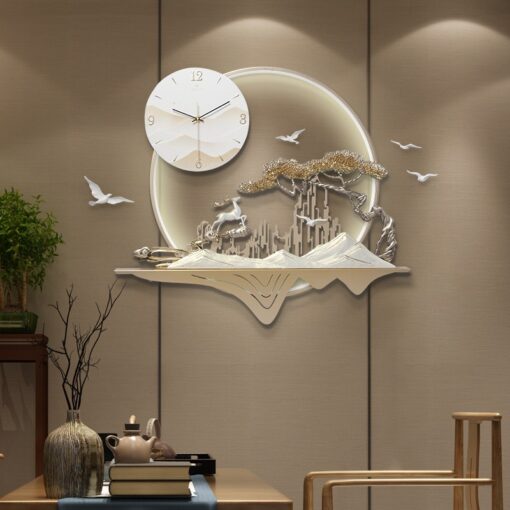 Phong cảnh sơn thủy với núi non, cây cối và dòng chảy đại diện cho sự cân bằng giữa yếu tố âm và dương. Thiết kế đồng hồ này không chỉ làm đẹp không gian mà còn giúp cân bằng năng lượng, mang lại cảm giác bình yên và hài hòa.