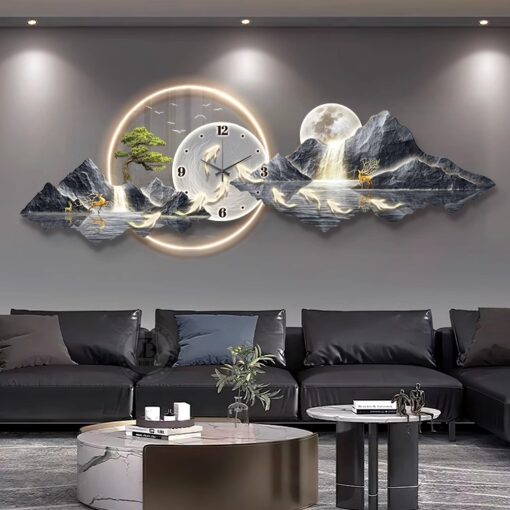 Với thiết kế bức tranh sơn thủy trải dài, đồng hồ không chỉ là công cụ xem giờ mà còn giúp mở rộng không gian một cách trực quan. Các chi tiết như thác nước, hồ nước và ánh trăng giúp căn phòng có chiều sâu hơn, tạo cảm giác rộng rãi, thoáng đãng cho những không gian nhỏ hẹp.