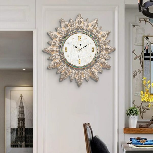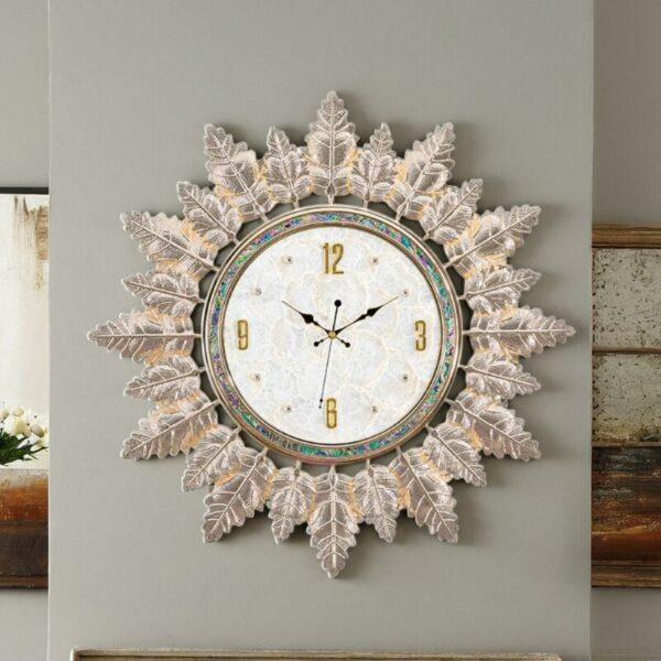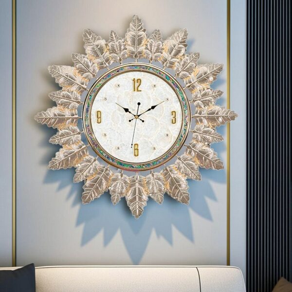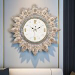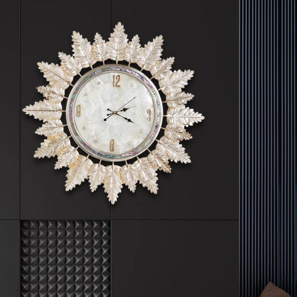 Đồng hồ lấy cảm hứng từ biểu tượng vầng dương tỏa sáng, biểu thị sự sống, năng lượng tích cực và nguồn sáng dẫn lối cho mọi sự thành công. Vòng nguyệt quế bao quanh tượng trưng cho sự vinh quang, chiến thắng và may mắn. Sự kết hợp này không chỉ làm đẹp không gian mà còn mang ý nghĩa phong thủy sâu sắc, giúp gia chủ thu hút tài lộc và thịnh vượng.