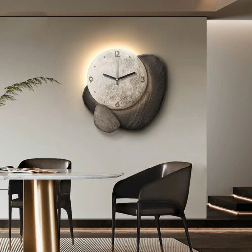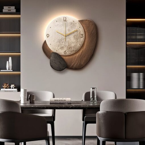 Nếu căn phòng của bạn có tường màu trung tính như xám, trắng hoặc kem, đồng hồ này sẽ trở thành trung tâm thu hút ánh nhìn. Ánh sáng dịu nhẹ từ lớp sứ pha lê giúp không gian sáng hơn, trong khi các mảng thạch cổ mang lại chiều sâu và sự ấm áp.