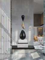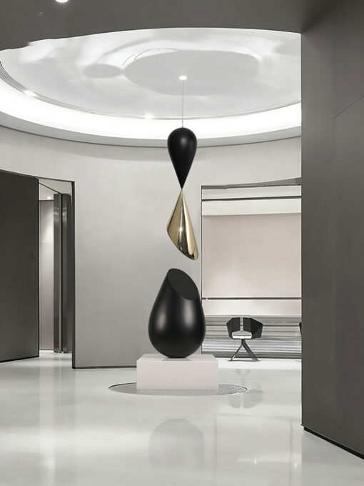 “Mô hình ‘Giọt Ngọc Trầm Mặc Nghệ Thuật’ là biểu tượng của sự tinh tế và thanh lịch. Với thiết kế giọt nước uốn lượn mềm mại, kết hợp sắc đen chủ đạo và điểm nhấn kim loại vàng sáng bóng, tác phẩm mang đến cảm giác huyền bí, sang trọng. Sự hòa quyện giữa các hình khối tạo nên nét cân bằng hài hòa, phù hợp trang trí không gian nội thất hiện đại, mang lại vẻ đẹp nghệ thuật độc đáo và điểm nhấn thu hút cho căn phòng.”