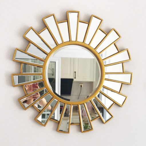 Gương “Hào Quang Tỏa Sáng” được thiết kế với hình tròn trung tâm, bao quanh là những chi tiết hình chữ nhật cách điệu tỏa ra như ánh hào quang của mặt trời. Kiểu dáng này không chỉ tạo ấn tượng mạnh mẽ mà còn giúp gương nổi bật trong mọi không gian. Với sự sắp xếp cân đối nhưng không nhàm chán, sản phẩm mang lại sự hòa quyện giữa yếu tố hiện đại và cổ điển.