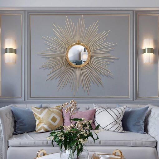 Phòng khách là nơi thể hiện gu thẩm mỹ của gia chủ, và gương “Mặt Trời Rạng Rỡ” chính là lựa chọn lý tưởng để tạo điểm nhấn nổi bật. Đặt gương trên tường phía sau sofa hoặc bên trên kệ TV, bạn sẽ ngay lập tức cảm nhận được sự khác biệt. Ánh sáng phản chiếu từ gương không chỉ làm sáng không gian mà còn tạo hiệu ứng thị giác, giúp căn phòng trở nên rộng rãi hơn.