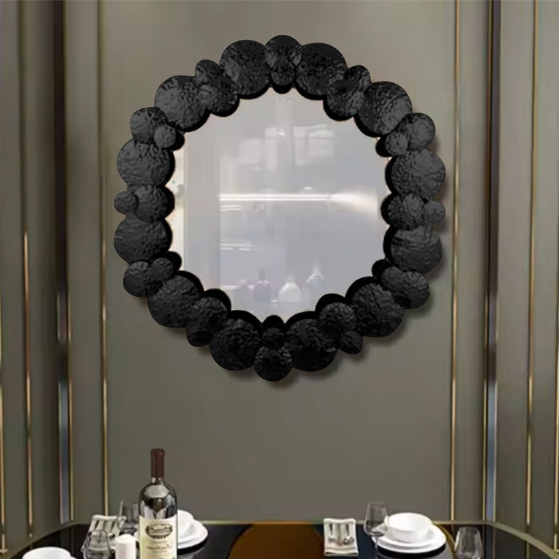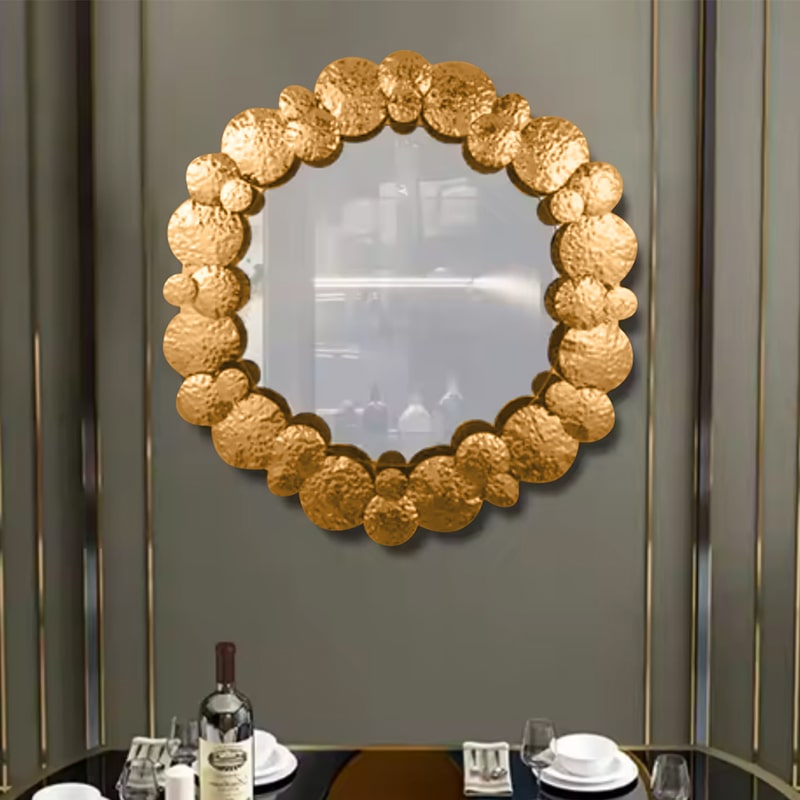 Gương decor Vũ Điệu Ánh Kim được thiết kế với hình tròn trung tâm, bao quanh bởi các khối tròn hợp kim mạ vàng lấp lánh, sắp xếp xen kẽ với họa tiết búa gõ tinh tế. Những khối tròn này tạo nên cảm giác sống động, như một vũ điệu ánh sáng đang chuyển động, thu hút ánh nhìn ngay từ cái nhìn đầu tiên.