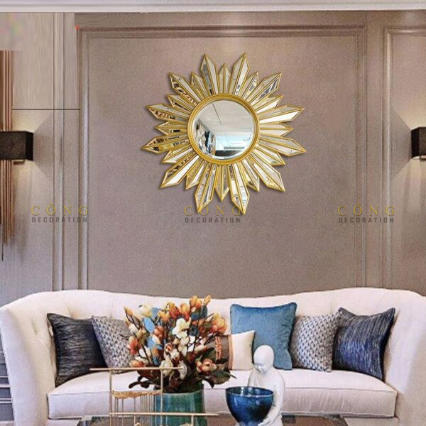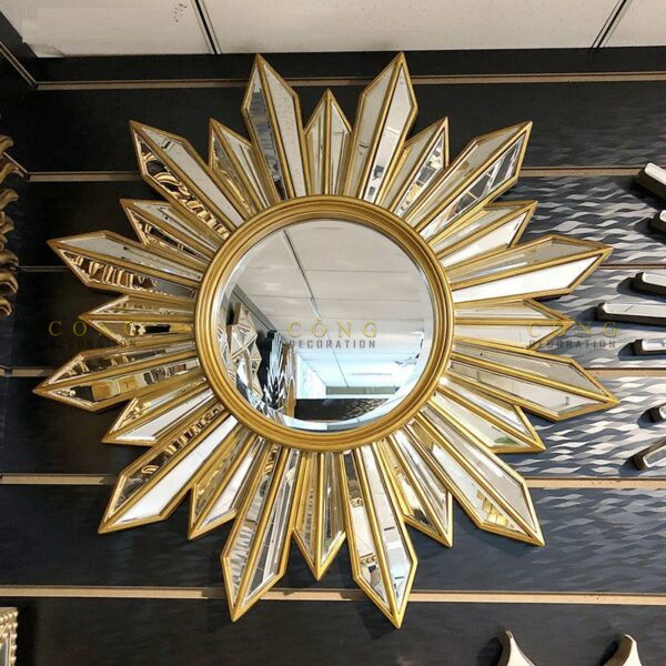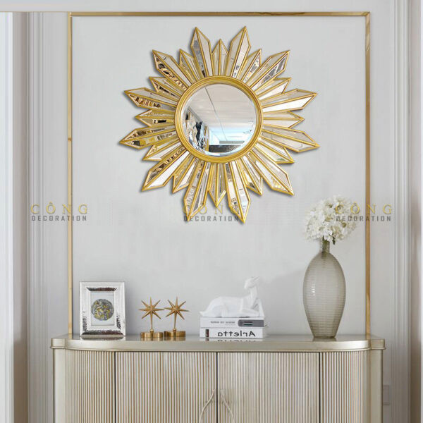 Với thiết kế ánh kim nổi bật, gương decor này kích thích dòng năng lượng tài lộc, giúp gia chủ thu hút sự giàu sang và thịnh vượng. Đặc biệt, đặt gương ở phòng khách hoặc lối vào sẽ mang lại sự may mắn và thành công trong công việc và cuộc sống.
