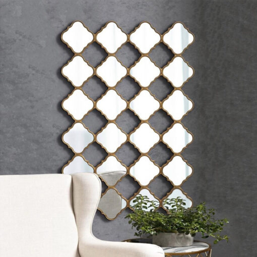 Gương Treo Tường Nghệ Thuật Cỏ Bốn Lá lấy cảm hứng từ hình dáng của loài cỏ bốn lá – biểu tượng của sự may mắn và thịnh vượng. Mỗi mảnh gương được ghép nối tỉ mỉ để tạo thành hình cỏ bốn lá đối xứng, đem lại cảm giác hài hòa và cân đối. Sự kết hợp giữa khung viền kim loại mạ vàng và mặt gương cao cấp tạo nên một tổng thể sang trọng, đẳng cấp.