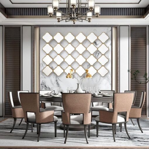 Nhờ khả năng phản chiếu, gương giúp không gian trở nên sáng sủa và rộng rãi hơn. Đặc biệt, hình dạng cỏ bốn lá với bố cục đối xứng tạo nên hiệu ứng thị giác thú vị, thu hút ánh nhìn và làm bừng sáng toàn bộ căn phòng.