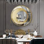 Trong phòng ăn, gương decor không chỉ giúp tăng ánh sáng mà còn mang lại sự ấm áp và gần gũi. Đặt gương Vầng Trăng Hoàn Mỹ trên bức tường gần bàn ăn sẽ giúp phản chiếu ánh sáng từ đèn chùm hoặc ánh sáng tự nhiên, tạo nên không gian ăn uống đầy phong cách.