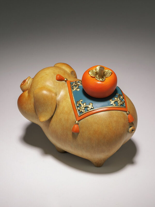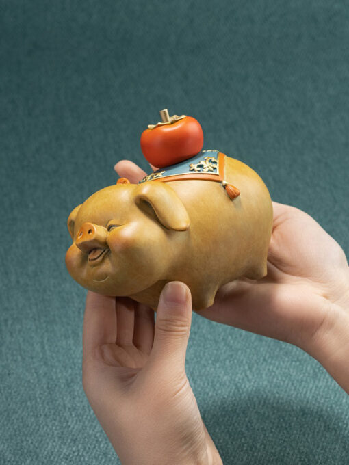 Quả hồng đỏ trên lưng heo không chỉ làm tăng giá trị thẩm mỹ của tác phẩm mà còn mang ý nghĩa phong thủy đặc biệt, tượng trưng cho sự ngọt ngào, may mắn và phúc lộc dồi dào. Sự kết hợp giữa heo vàng và quả hồng tạo nên một vật phẩm hoàn hảo để kích hoạt năng lượng tích cực trong không gian sống.