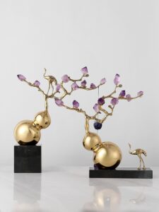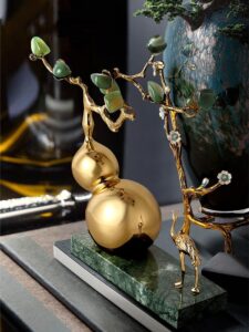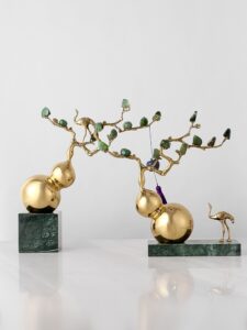 - Chất liệu cao cấp: Sản phẩm được làm từ chất liệu đồng, đá mã não và đế đá cẩm thạch, mang lại độ bền lâu dài và vẻ đẹp sang trọng.