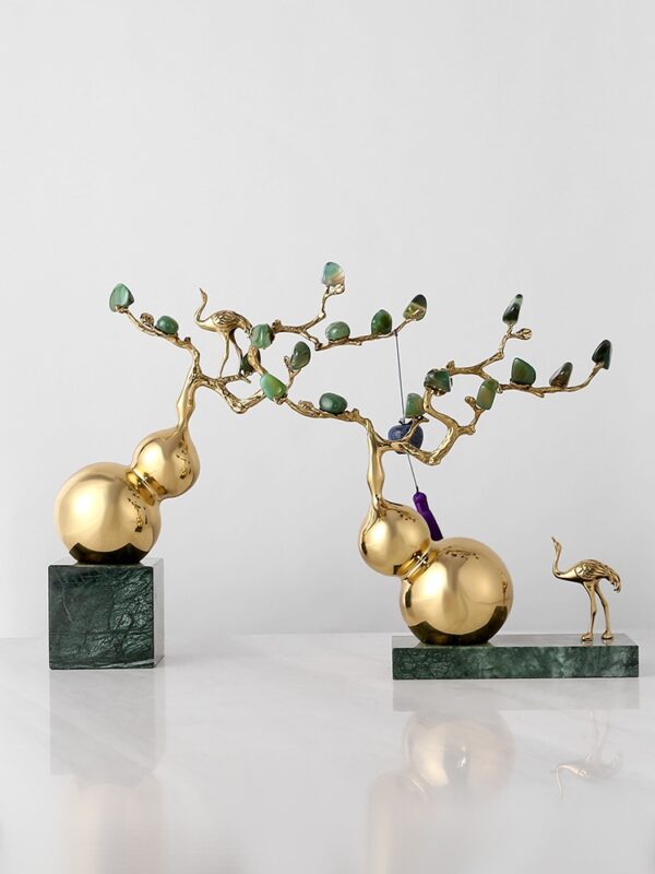 Tượng Hồ Lô Tài Lộc Gắn Đá là biểu tượng mang nhiều ý nghĩa phong thủy sâu sắc, tượng trưng cho sự viên mãn, sung túc và bình an trong cuộc sống. Với chất liệu kim loại sáng bóng phối hợp cùng đá quý xanh sang trọng, sản phẩm không chỉ là món đồ trang trí tinh tế mà còn giúp thu hút năng lượng tích cực và tài lộc cho gia chủ. Hồ Lô được thiết kế cách điệu hài hòa cùng hình ảnh chim hạc, biểu trưng cho sức khỏe và thịnh vượng, tạo nên điểm nhấn đẳng cấp cho không gian sống hoặc làm việc của bạn.