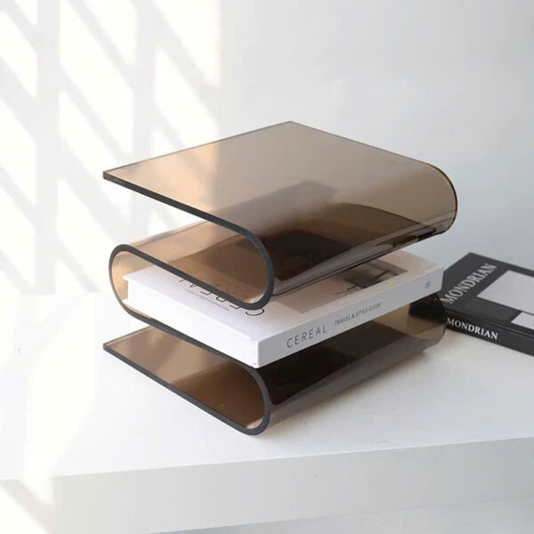 Kệ để tạp chí acrylic với thiết kế uốn lượn độc đáo, hiện đại là giải pháp tuyệt vời cho không gian sống và làm việc. Chất liệu acrylic trong suốt hoặc màu khói giúp sản phẩm vừa nhẹ nhàng vừa bền bỉ, dễ dàng làm sạch. Kiểu dáng cong mềm mại không chỉ tăng tính thẩm mỹ mà còn tiện lợi trong việc sắp xếp sách báo, tạp chí hay các vật dụng nhỏ gọn khác. Kệ phù hợp với phong cách tối giản, hiện đại, giúp không gian trở nên gọn gàng, tinh tế và có điểm nhấn nổi bật.