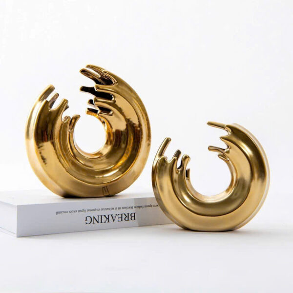 Khối decor vòng xoáy ánh kim đẳng cấp gây ấn tượng mạnh với thiết kế hiện đại và sáng tạo, mang hình dáng vòng xoắn độc đáo như những làn sóng chuyển động mềm mại. Lớp phủ ánh kim vàng bóng bẩy làm nổi bật sự sang trọng, tinh tế và đẳng cấp, phù hợp với nhiều phong cách nội thất khác nhau từ hiện đại đến tân cổ điển. Sản phẩm không chỉ là món đồ trang trí độc đáo mà còn tạo điểm nhấn nghệ thuật, góp phần làm tăng giá trị thẩm mỹ cho không gian phòng khách, bàn làm việc hoặc kệ sách của bạn.