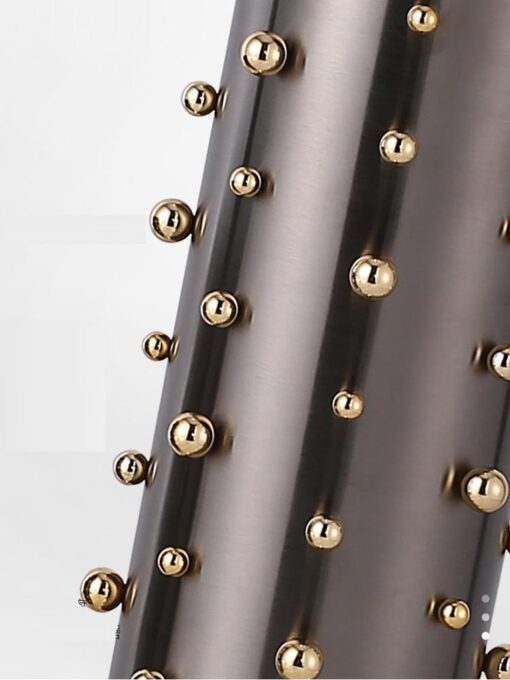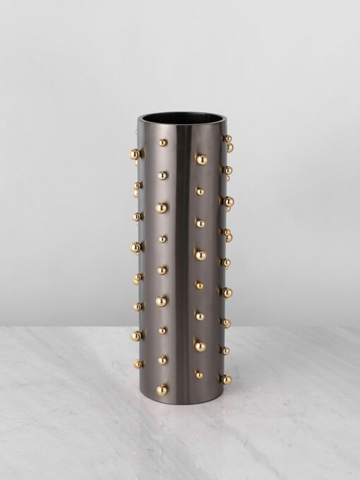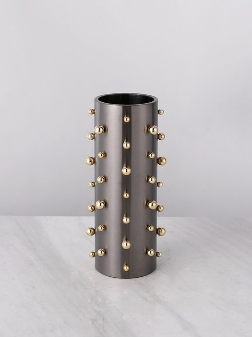 Lọ cắm hoa với thiết kế kim loại cao cấp, nổi bật bởi các chấm tròn mạ vàng tinh tế trên nền kim loại xám sang trọng. Phong cách hiện đại kết hợp sự quý phái giúp sản phẩm dễ dàng hòa hợp với nhiều không gian nội thất, tạo điểm nhấn thu hút cho bàn ăn, phòng khách hoặc phòng làm việc. Đây là lựa chọn lý tưởng cho những ai yêu thích vẻ đẹp đẳng cấp và phá cách.